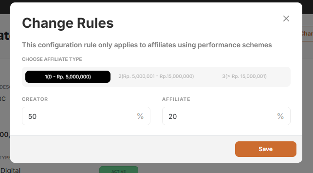 untuk pergantian per produk, kamu bisa klik tombol change rules di bagian atas. setelah di klik akan muncul tampilan untuk mengatur komisi. kamu bisa mengatur performance rank 1, 2, dan 3. rank 1, kamu bisa memberikan komisi hingga 70%, rank 2 kamu dapat memberikan hingga 80%, dan rank 3, kamu bisa memberikan hingga 90%. setelah mengaturnya, kamu dapat klik save, dan semua pengaturan akan mempengaruhi komisi affiliate yang mendaftar produk kamu.