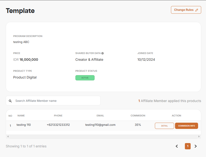 klik detail pada prouk yang ingin kamu ganti aturan komisinya, setelah di klik akan muncul tampilan tampilan dashboard dari produk tersebut. kamu bisa mengganti komisi untuk semua affiliate yang mendaftar produk kamu, atau spesifik affiliate.