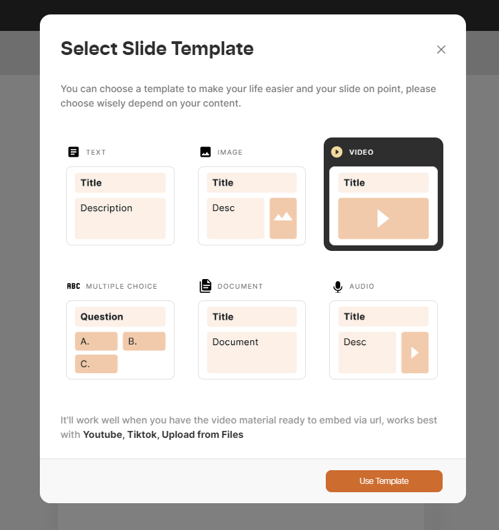 > Tipe file video hanya bisa **.mp4, .mkv, .avi, .wmv, .mov.** file video memiliki limitasi maksimal 1gb per komponen. semua file yg di upload akan mengambil sisa storage dari chief/creator, jika tidak mencukupi maka file tidak akan bisa di upload&#x20;